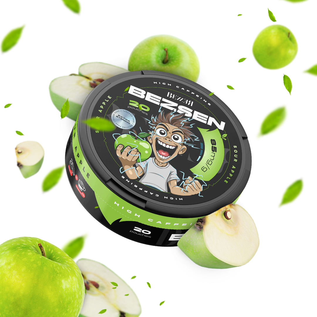 BEZSEN Sour Apple 85 mg to saszetki kofeinowe o umiarkowanej mocy, łączące przyjemny, kwaskowaty smak zielonego jabłka z wygodną formą stosowania. Produkt zapewnia szybkie, dyskretne pobudzenie bez potrzeby spożywania kawy czy napojów energetycznych.